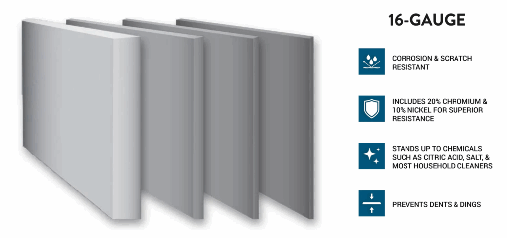 We begin by Sand Blasting the sink to create a satin finish. We then use a process called PVD which vaporizes chromium & deposits the metal into the sink surface at a micron level, changing its color & adding to its durability. We finalize by added nano-coating, which creates a smoother, more easily cleaned surface. It’s often called ceramic coating, & is used on new automobiles to improve the look & longevity of the finish.