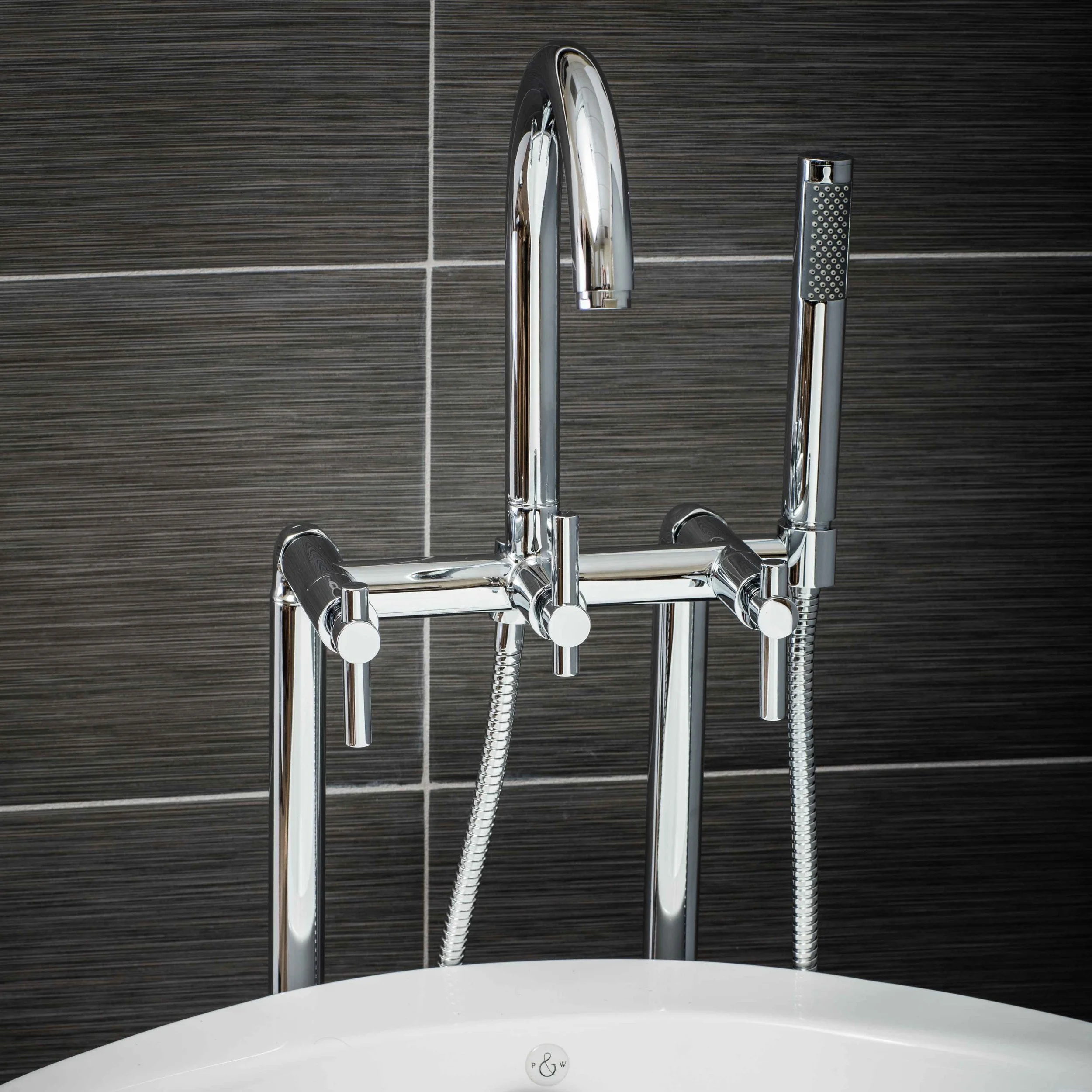 Luxury floor-mount tub faucet package, including faucet body, valves, floor-mount risers and escutcheons, three handles, hose and handshower.